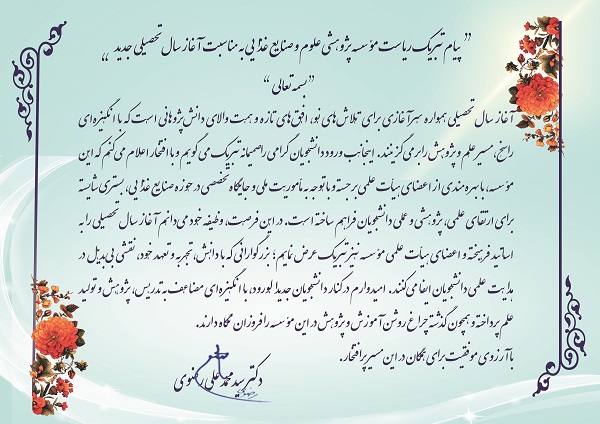 آغاز سال تحصیلی همواره سرآغازی برای تلاشهای نو، افقهای تازه و همت والای دانشپژوهانی است که با انگیزهای راسخ، مسیر علم و پژوهش را برمیگزینند. اینجانب ورود دانشجویان گرامی را صمیمانه تبریک می گویم و با افتخار اعلام میکنم که این مؤسسه، با بهرهمندی از اعضای هیأت علمی برجسته و با توجه به مأموریت ملی و جایگاه تخصصی در حوزه صنایع غذایی، بستری شایسته برای ارتقای علمی، پژوهشی و عملی دانشجویان فراهم ساخته است.